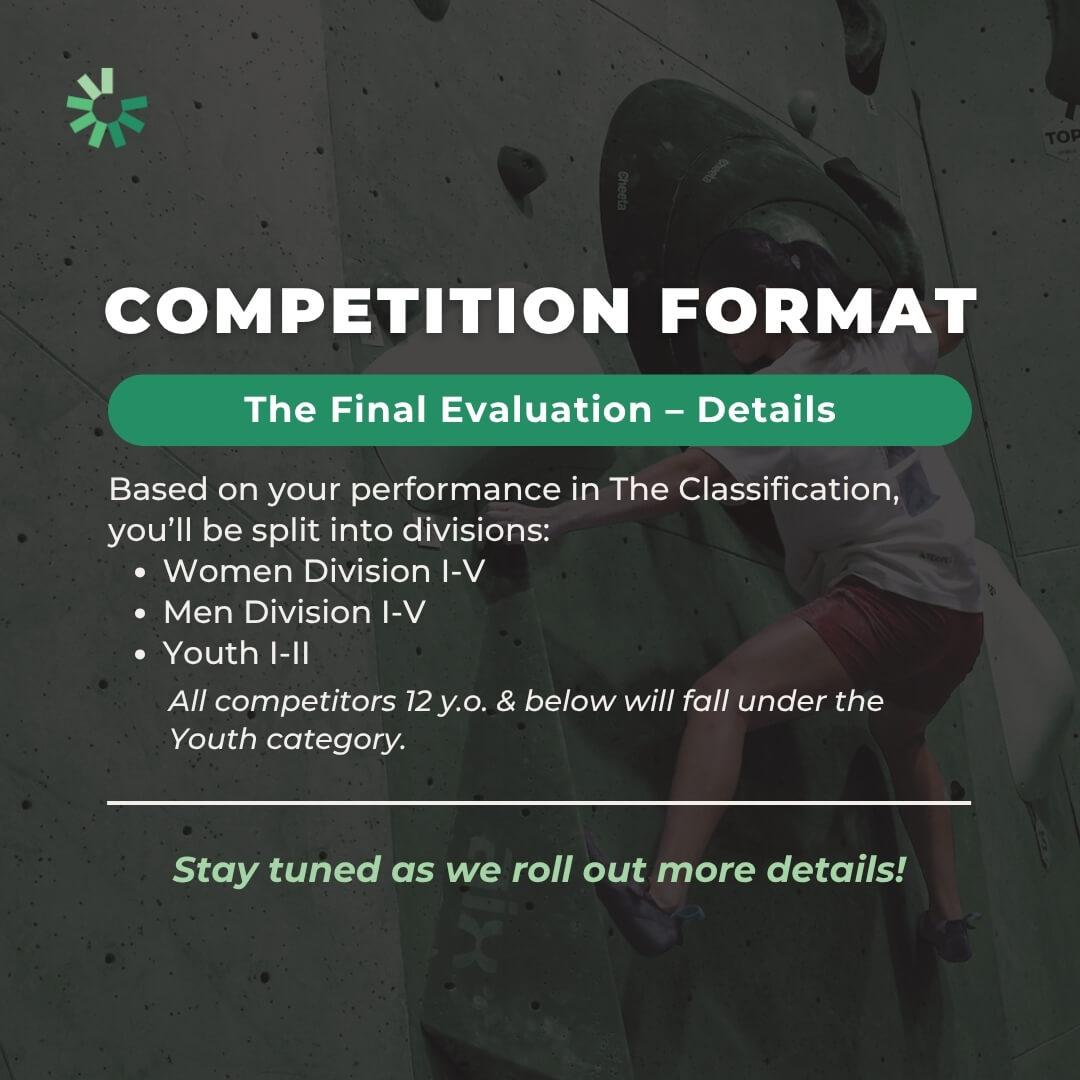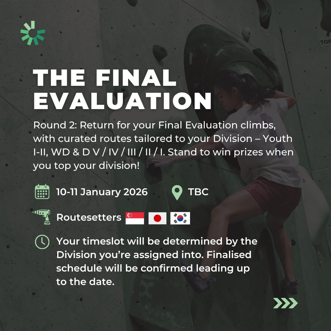Come back for The Final Evaluation, where you will be faced with curated routes tailored to the division you were classified into based on your performance in the first round. Experience routes that are carefully curated in a collaborative effort between fit · bloc and our guest setters. Climb against others in your division and find out where you stand. Prizes are awarded to the top participants of each division!